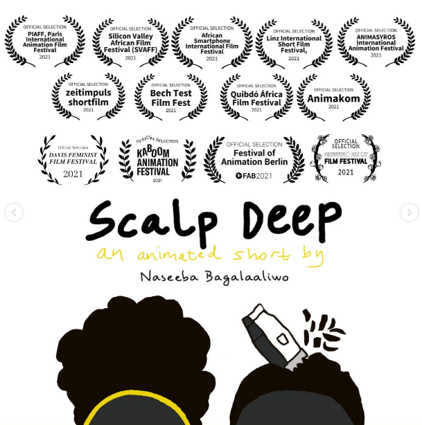 SCALP DEEP – An animated short by Naseeba Bagalaaliwo, Scalp Deep follows a lady who cuts her long hair and receives much scrutiny for it. This prompts old memories of backlash for having long-black-beautiful hair as a child, but advice from her loving mother induces confidence and the will to go against societal labels.