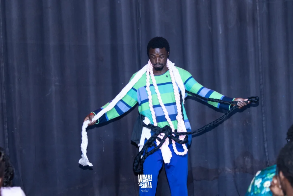 The one-man show made its stop at Alliance Française Mombasa on October 29th during the Wimbi la Sanaa festival. It’s been raining for the better part of the day, and the weather is the kind that threatens to dull an audience’s spirit, but not this one. They wait, eager to see what this young man has brought to their city.