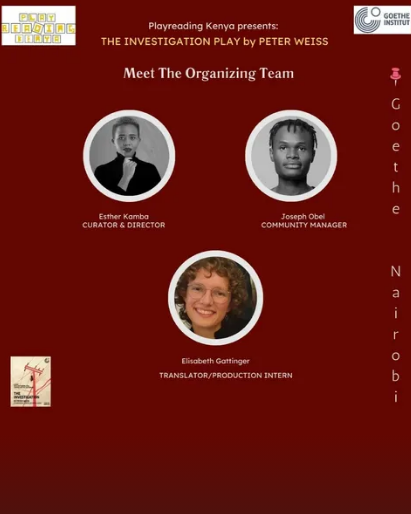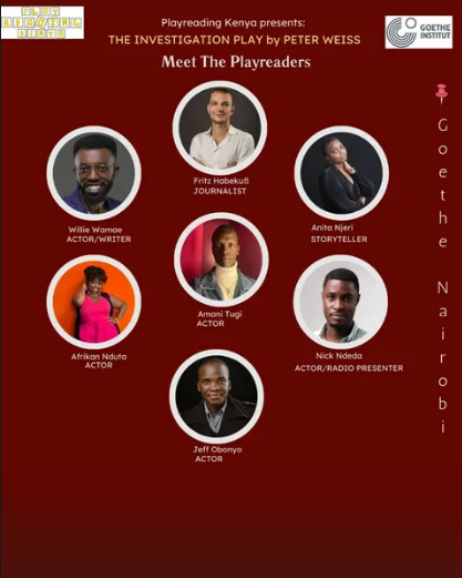 Play Reading Kenya, curated by Esther Kamba and Joseph Obel, brought Peter Weiss’ The Investigation to life at the Goethe-Institut. Translated from German to English, the docuplay features witness testimonies from the Frankfurt Auschwitz Trials of 1963–1965.